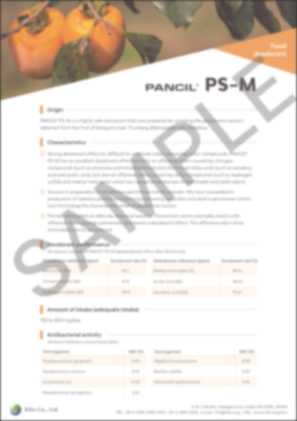 PANCIL PS-M is natural deodorant ingredients derived from Japanese Persimmon fruit for Health Food and Oral care products. It has strong deodorant effect for offensive malodor such as Ammonia, Isovaleric acid, Hydrogen